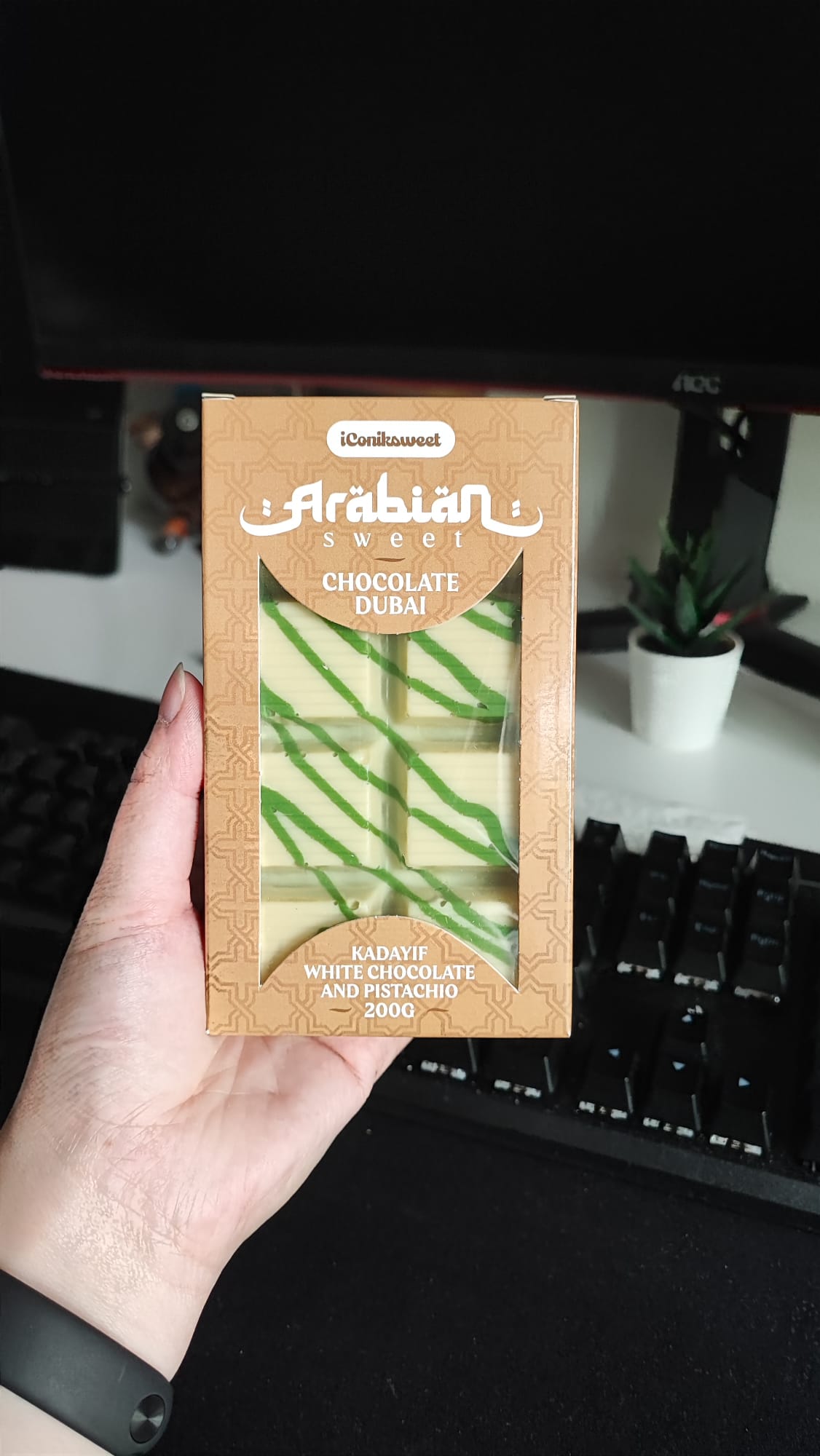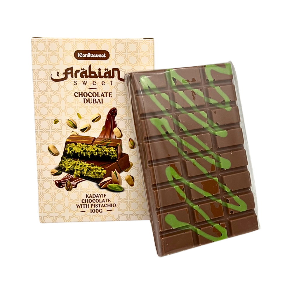 De Dubai chocoladereep onderscheidt zich door zijn unieke combinatie van smeuïge pistachepasta en krokante kunafeh (een traditioneel Midden-Oosters dessert van fijn filodeeg). Deze mix van romige en knapperige texturen, samen met hoogwaardige chocolade, zorgt voor een onvergetelijke smaakervaring.